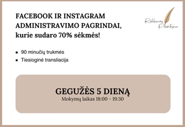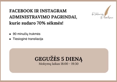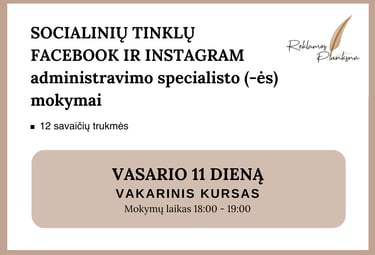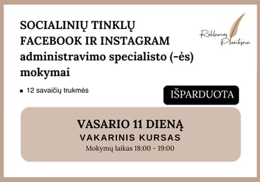 Sukaupusi darbo patirtį ir gebanti puikiai perduoti savo žinias kitiems, pradėjau vesti socialinių tinklų Facebook ir Instagram mokymus, smulkiąjam ir/ar vidutiam verslui. Ruošti socialinių tinklų specialistus (-es), kol ši profesija yra itin sparčiai auganti ir paklausi rinkoje. Mokymų metu perduodu visą patirtį nuosekliai, aiškiai ir konkrečiai. Viską nuo A iki Z po žingsnelį. Neskubant ir kantriai. Dalinuosi kokių klaidų nedaryti, kurias dariau pati. Nes tuo metu, kada pradėjau administruoti įmonių paskyras, tokių mokymų rinkoje lietuvių kalba - praktiškai nebuvo. Tad buvau savamokslė, ko dėka išmokau visko pati, klaidų/bandymų būdu. O dabar sėkmingai dalinuosi su Jumis.