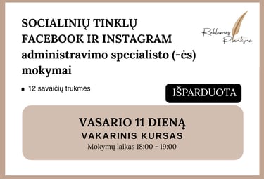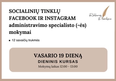 Aš, lektorė Aušra, padedu smulkiąjam ir vidutiniam verslui, pozicionuoti savo prekinį ženklą, Facebook ir Instagram paskyrose. Teikiu individualius ir grupinius mokymus, Jums ir/ar Jūsų įmonės darbuotojams, kurie rūpinasi verslo pozicionavimu socialiniuose tinkluose.